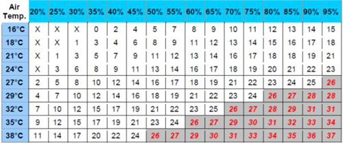 露點表根據(jù)濕度和溫度給出(chu)露點溫度(C),冷卻水(shui)必須高于露點溫(wen)度以防止結露。